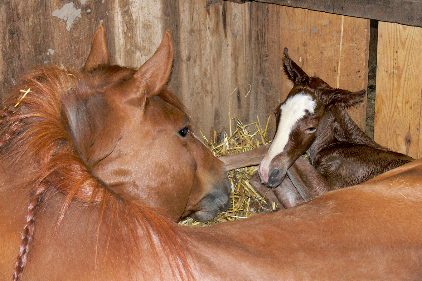 Ob die Stute im eigenen Stall abfohlt oder in einem Zuchtstall, spätestens vier bis sechs Wochen vor der Geburt sollte sie ihr neues Quartier, sprich die geräumige Abfohlbox beziehen, damit sie sich an das neue Keimmilieu gewöhnen kann. Anfangs kann die Box noch mit Spänen eingestreut sein, aber kurz vor dem Geburtstermin sollte auf Stroh gewechselt werden, da Späne-Einstreu am nassen Fohlenfell, Nüstern und Augen kleben bleibt.