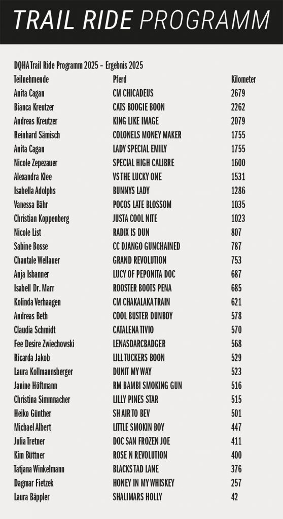 Die DQHA gratuliert allen Teilnehmenden und ihren Pferden zu ihren großartigen Leistungen und wünschen allen auch für das Trail Ride Jahr 2026 viele schöne Stunden in der Natur!